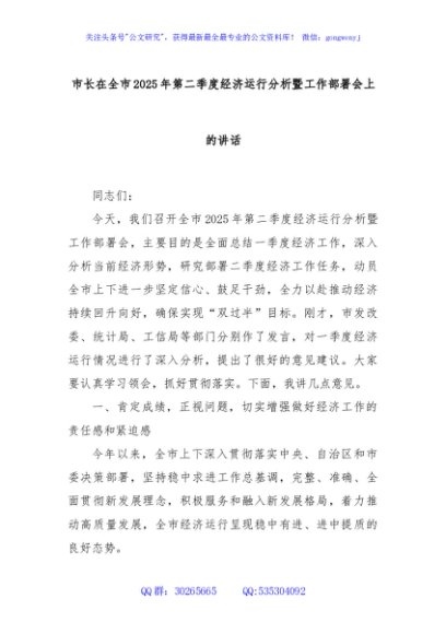 / 市长在全市2025年第二季度经济运行分析暨工作部署会上的讲话