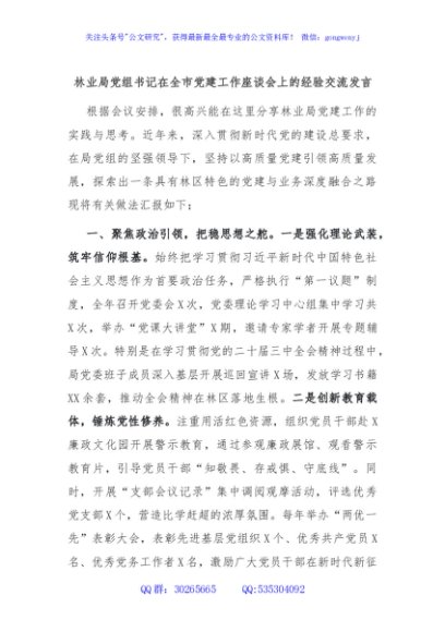 / 林业局党组书记在全市党建工作座谈会上的经验交流发言