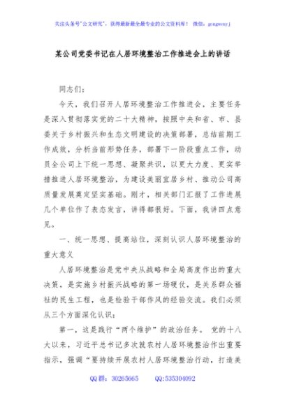 / 某公司党委书记在人居环境整治工作推进会上的讲话