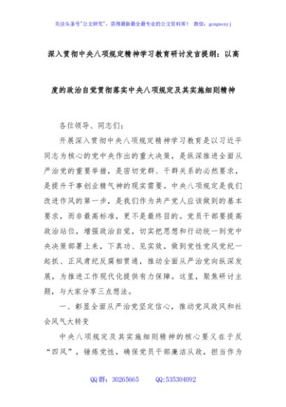 深入贯彻中央八项规定精神学习教育研讨发言提纲:以高度的政治自觉贯彻落实中央八项规定及其实施细则精神