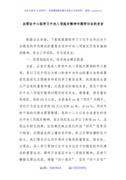 在理论中心组学习中央八项规定精神专题研讨会的发言