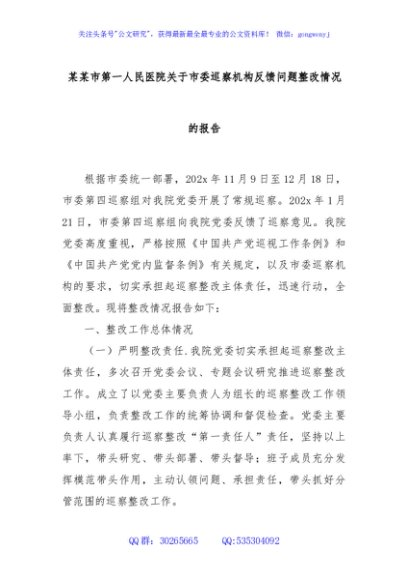 / 某某市第一人民医院关于市委巡察机构反馈问题整改情况的报告