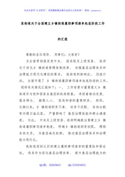 / 某街道关于全面建立乡镇街道履职事项清单起底阶段工作的汇报
