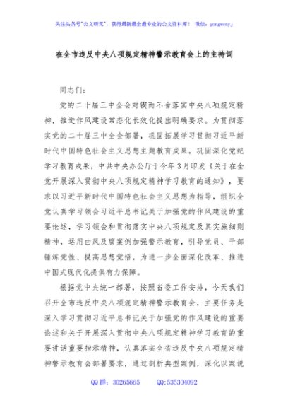 / 在全市违反中央八项规定精神警示教育会上的主持词