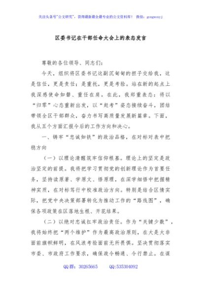 / 区委书记在干部任命大会上的表态发言