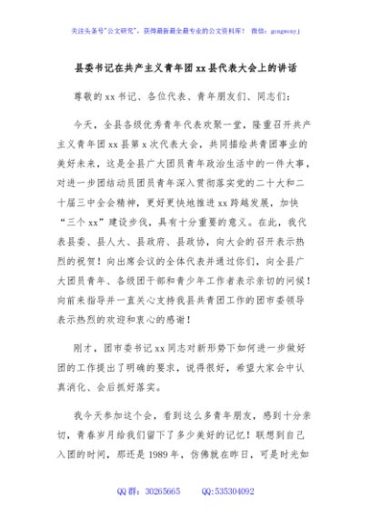 / 县委书记在共产主义青年团xx县代表大会上的讲话