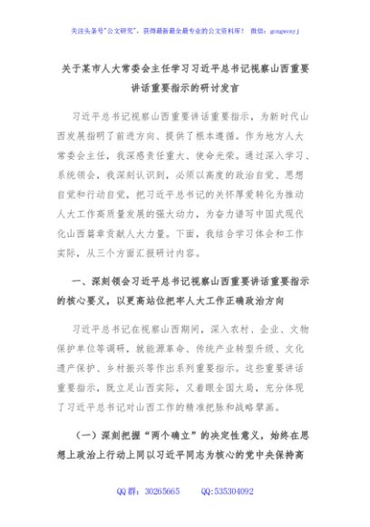 / 关于某市人大常委会主任学习习近平总书记视察山西重要讲话重要指示的研讨发言