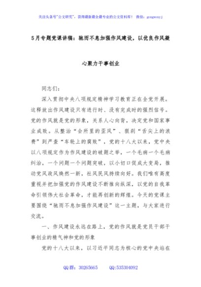 / 5月专题党课讲稿:驰而不息加强作风建设,以优良作风凝心聚力干事创业