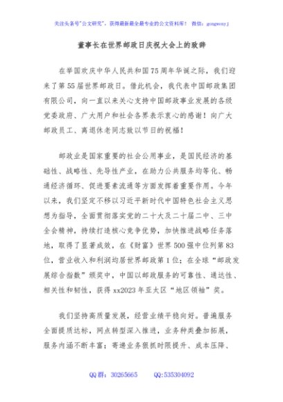 / 董事长在世界邮政日庆祝大会上的致辞