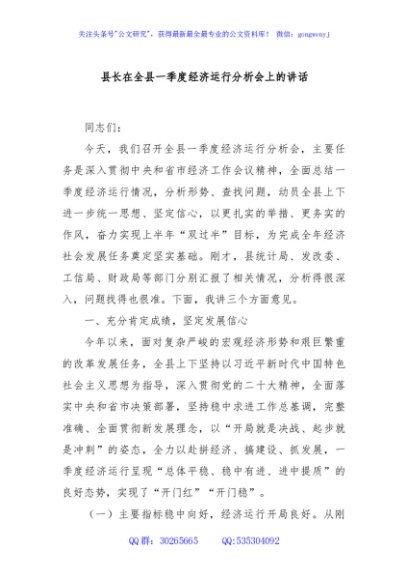/ 县长在全县一季度经济运行分析会上的讲话
