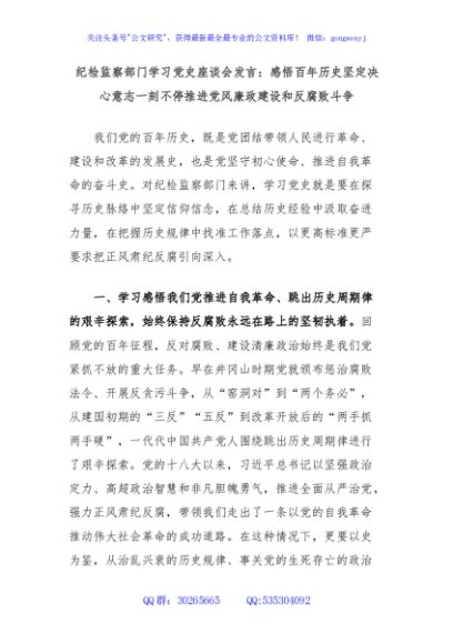 / 纪检监察部门学习党史座谈会发言:感悟百年历史坚定决心意志一刻不停推进党风廉政建设和反腐败斗争