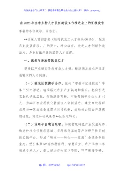 / 在2025年全市乡村人才队伍建设工作推进会上的汇报发言