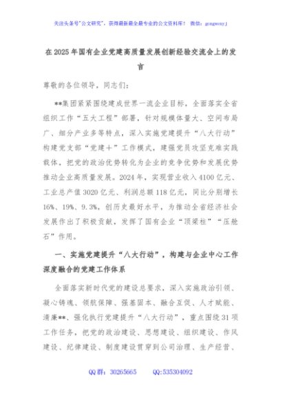 / 在2025年国有企业党建高质量发展创新经验交流会上的发言