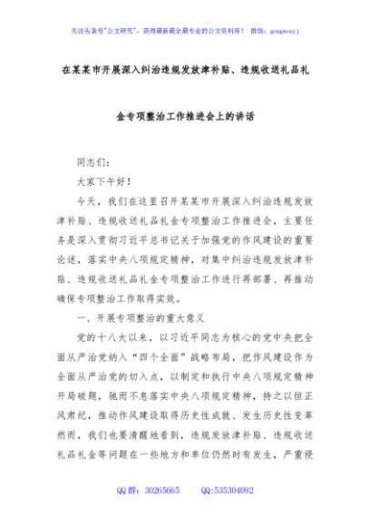 / 在某某市开展深入纠治违规发放津补贴、违规收送礼品礼金专项整治工作推进会上的讲话