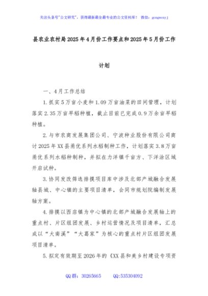 / 县农业农村局2025年4月份工作要点和2025年5月份工作计划