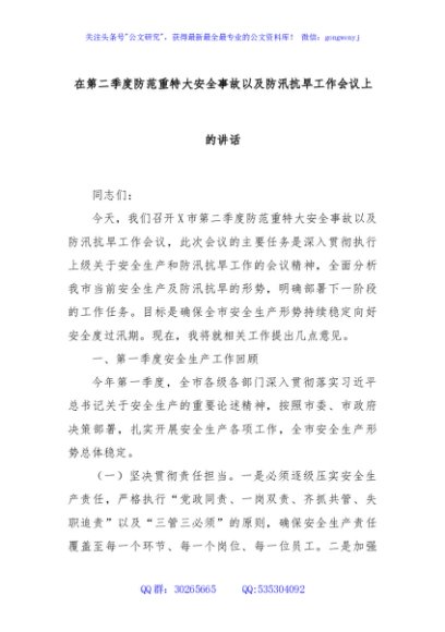 / 在第二季度防范重特大安全事故以及防汛抗旱工作会议上的讲话