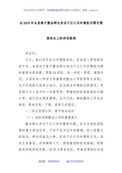 / 在2025年全县集中整治群众身边不正之风和腐败问题专题推进会上的讲话提纲