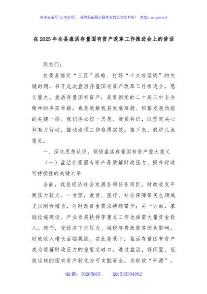 / 在2025年全县盘活存量国有资产改革工作推进会上的讲话