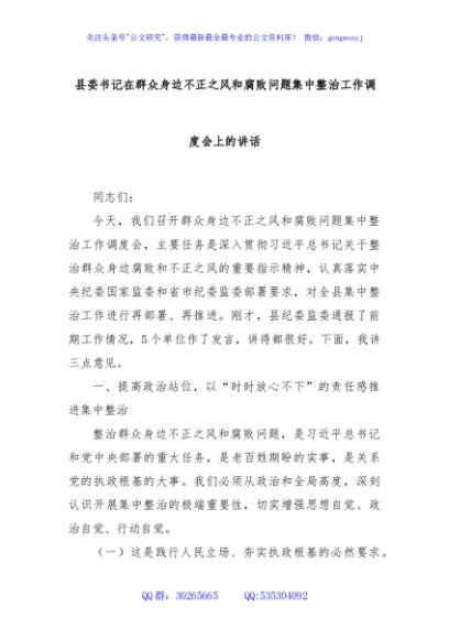 / 县委书记在群众身边不正之风和腐败问题集中整治工作调度会上的讲话