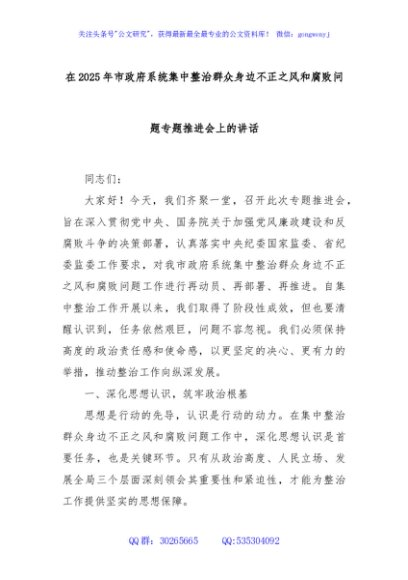 / 在2025年市政府系统集中整治群众身边不正之风和腐败问题专题推进会上的讲话