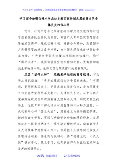学习领会给谢依特小学戍边支教西部计划志愿者服务队全体队员回信心得