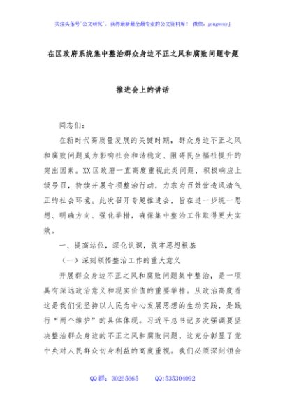 / 在区政府系统集中整治群众身边不正之风和腐败问题专题推进会上的讲话