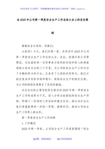 / 在2025年公司第一季度安全生产工作总结大会上的发言提纲