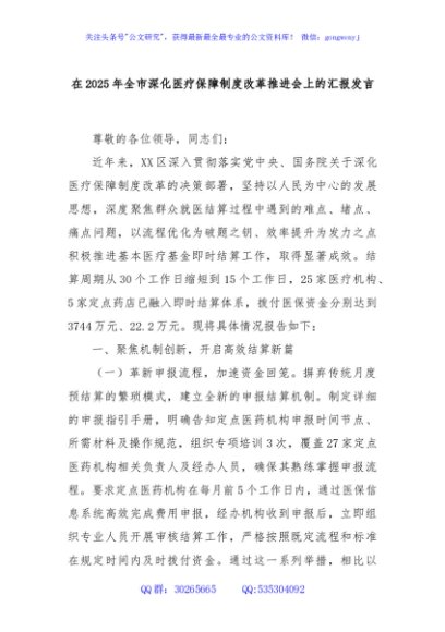 / 在2025年全市深化医疗保障制度改革推进会上的汇报发言