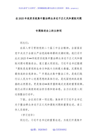 / 在2025年政府系统集中整治群众身边不正之风和腐败问题专题推进会上的主持词