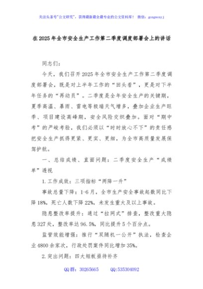 / 在2025年全市安全生产工作第二季度调度部署会上的讲话