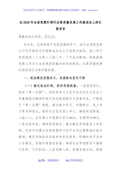 / 在2025年全省党建引领行业高质量发展工作座谈会上的汇报发言