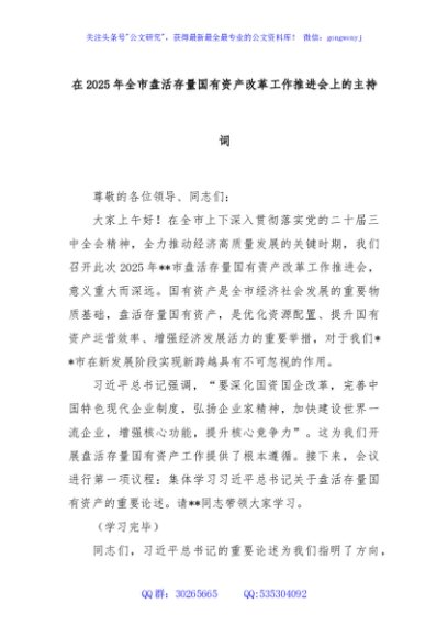 / 在2025年全市盘活存量国有资产改革工作推进会上的主持词