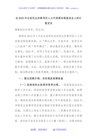 / 在2025年全省民生实事项目人大代表票决制座谈会上的汇报发言