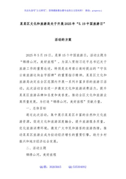 / 某某区文化和旅游局关于开展2025年“5.19中国旅游日”活动的方案