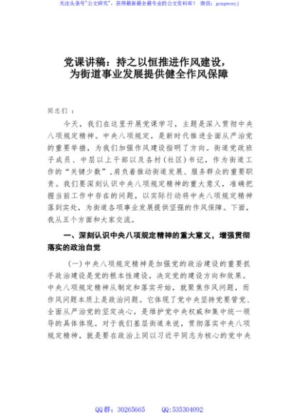 / 党课讲稿:持之以恒推进作风建设,为街道事业发展提供健全作风保障