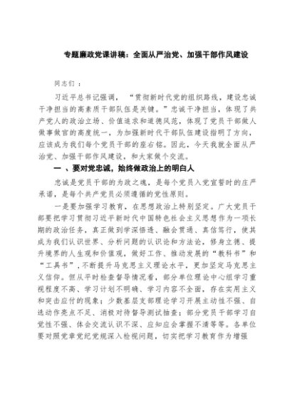 / 2025专题廉政党课讲稿:全面从严治党、加强干部作风建设(共七篇)