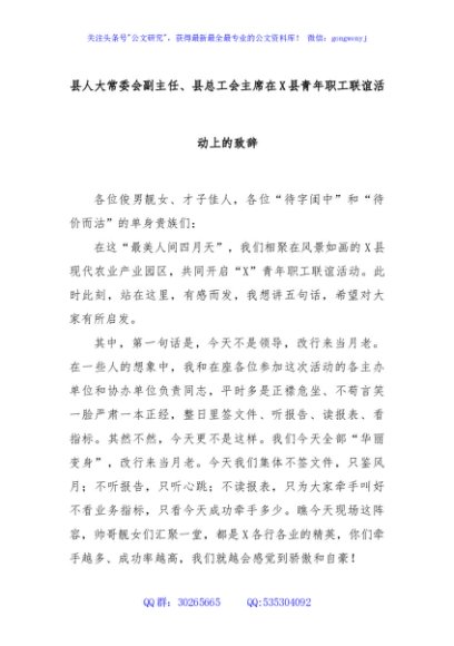 / 县人大常委会副主任、县总工会主席在X县青年职工联谊活动上的致辞