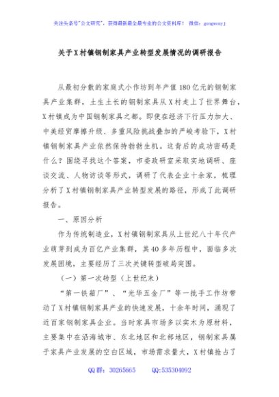 / 关于X村镇钢制家具产业转型发展情况的调研报告