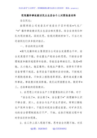 / 吸取爆炸事故教训民主生活会个人对照检查材料