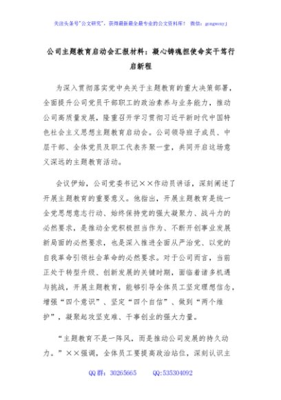 / 公司主题教育启动会汇报材料:凝心铸魂担使命实干笃行启新程
