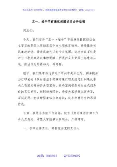 / 五一、端午节前廉政提醒谈话会讲话稿