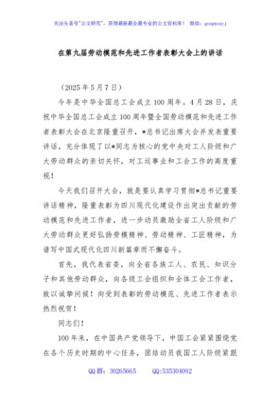 / 在第九届劳动模范和先进工作者表彰大会上的讲话
