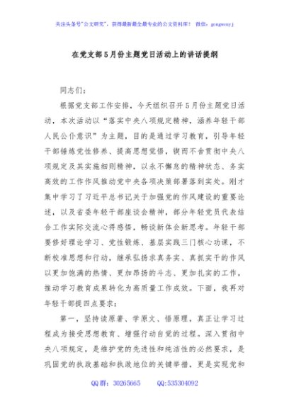 / 在党支部5月份主题党日活动上的讲话提纲