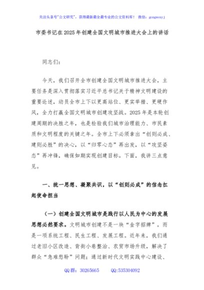 / 市委书记在2025年创建全国文明城市推进大会上的讲话