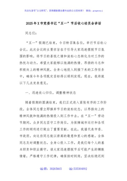 / 2025年X市党委书记“五一”节后收心动员会讲话