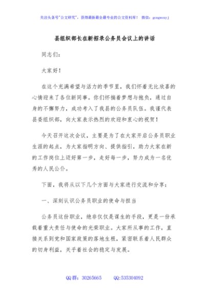 / 县组织部长在新招录公务员会议上的讲话