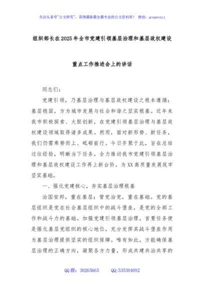/ 组织部长在2025年全市党建引领基层治理和基层政权建设重点工作推进会上的讲话