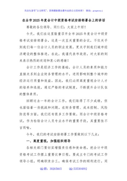 / 在全市2025年度会计中级资格考试安排部署会上的讲话