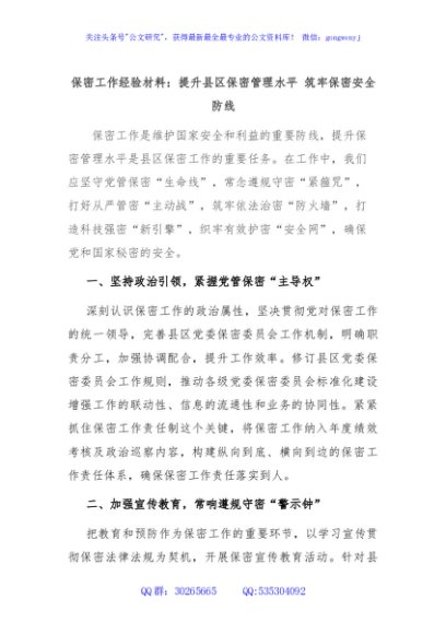 / 保密工作经验材料:提升县区保密管理水平 筑牢保密安全防线