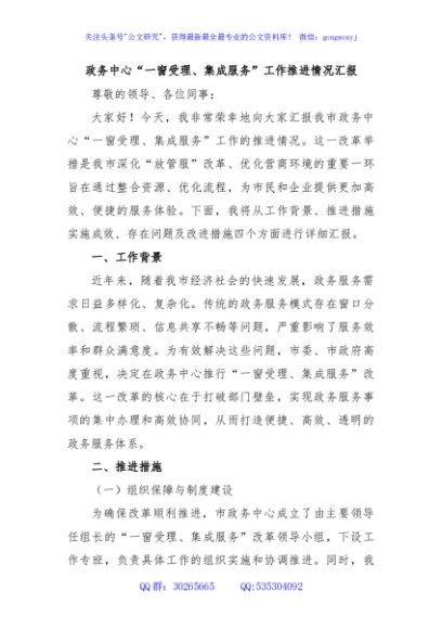 政务中心“一窗受理、集成服务”工作推进情况汇报